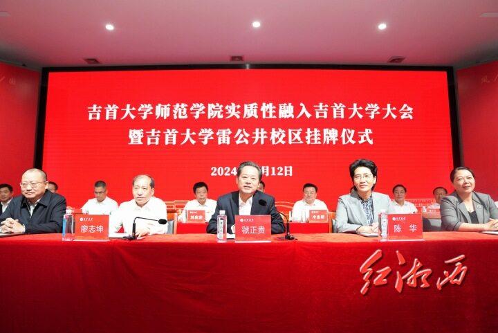 湘西网10月14日讯(全媒体记者 付丹)10月12日,在吉首大学建校66周年之际,吉首大学师范学院实质性融入吉首大学大会暨吉首大学雷公井校区挂牌仪式在吉首举行。湘西州委书记虢正贵出席并讲话,与州委副书记、州长陈华,吉首大学党委书记廖志坤、原校长黎奇升共同为吉首大学雷公井校区揭牌。州人大常委会主任吴凌频,州政协主席李平出席。