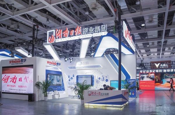 10月13日,湖南国际会展中心,湖南日报报业集团展台已完成布展。 作为新媒体大会主题活动之一,以“科文相融 新智相生”为主题的2024中国新媒体技术展将于10月14日至16日在湖南国际会展中心(芒果馆)举行。华声在线全媒体记者 辜鹏博 摄