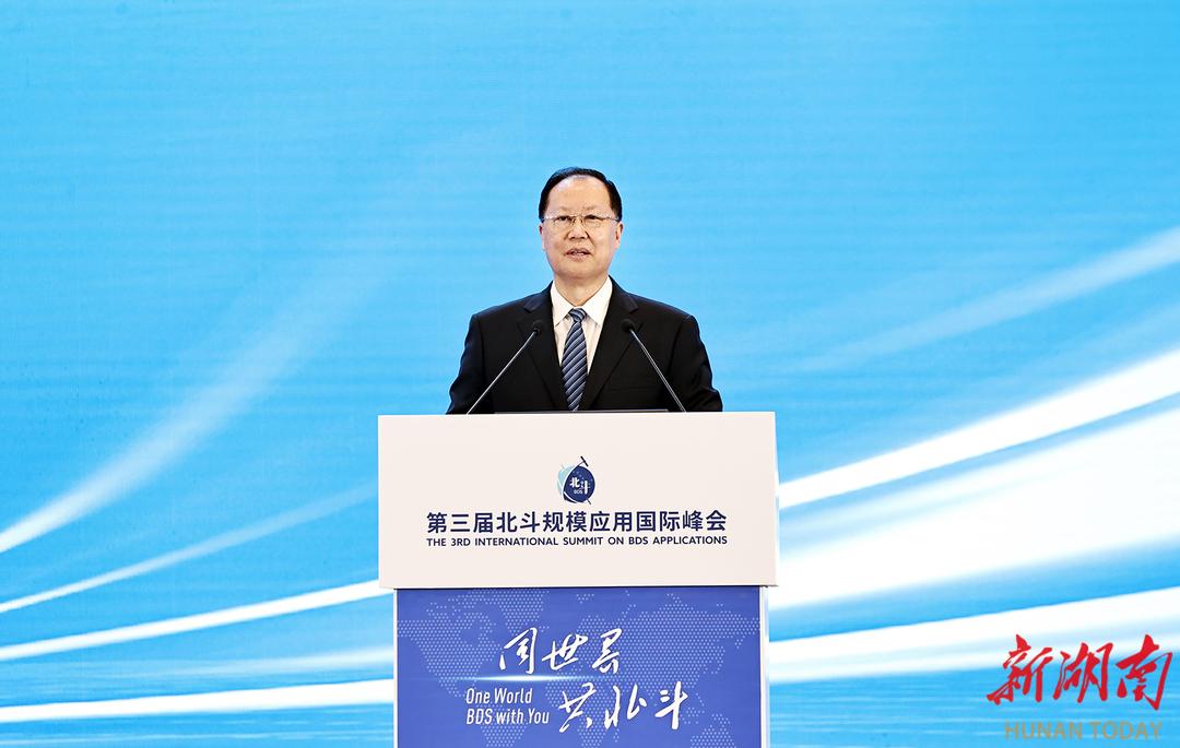 今年是北斗系统立项30周年。毛伟明在致辞中说,三十年策源,我们实现了从“仰望星空”到“经纬时空”跨越。湖南深入贯彻习近平总书记关于北斗产业发展的系列重要指示精神,充分发挥北斗核心技术策源地优势,全程参与北斗一号、二号、三号系统建设任务,助力北斗核心器部件100%自主可控,为“国之大者”贡献了“湖南之为”。三届峰会,我们成就了从“远在天边”到“用在身边”奔赴。湖南以举办北斗峰会为契机,加快推动技术攻关、产业集聚、场景应用,全省北斗产业总产值达450亿元,年均增速超25%。我们将坚持“三化”引领,致力推动“中国北斗”向“世界北斗”跃进。诚邀大家聚焦“市场化、产业化、国际化”方向,深度参与湖南北斗技术创新引领区、北斗规模应用示范区、北斗产业高质量发展集聚区建设,让“中国北斗”璀璨星空、精彩世界。