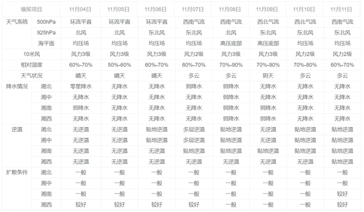 11月10至11日,全省多云间晴天,夜间至11日清晨湘中、湘南部分地区有雾,以本地累积为主,全省良至轻度污染。