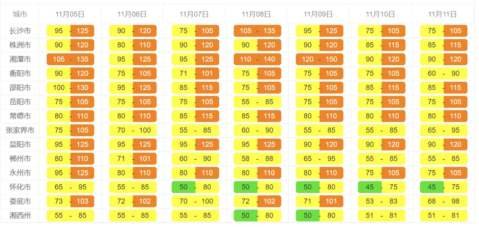 11月5日,全省多云间晴天,北风3~4级,有臭氧污染和生物质燃烧的风险,预计长沙、株洲、湘潭、益阳、衡阳、邵阳、永州为轻度污染,其他7个城市均为良。夜间随着边界层下降,污染物浓度易出现反弹现象,局地可能达到短时中度污染。