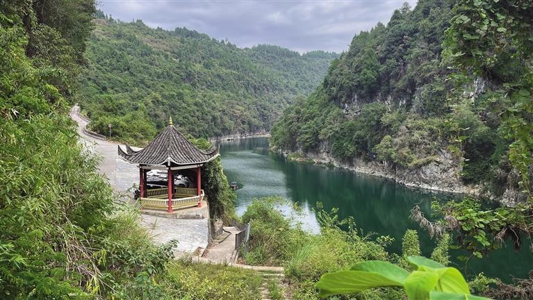 我站在列夕老码头上,看到猛洞河的水静静地汇在山谷之间。那水是静态的,看不出一点流动的迹象。只有偶尔吹来的一阵风,在河面掀起一点涟漪。抬头望去,是一条长长的河谷,河岸高达100多米,悬崖峭壁上,长满各种树和藤蔓,很多是倒垂着的,显得特别茂盛。再看蓝天,只有河谷上面的一线,有白云飘忽,有鸟儿飞翔。