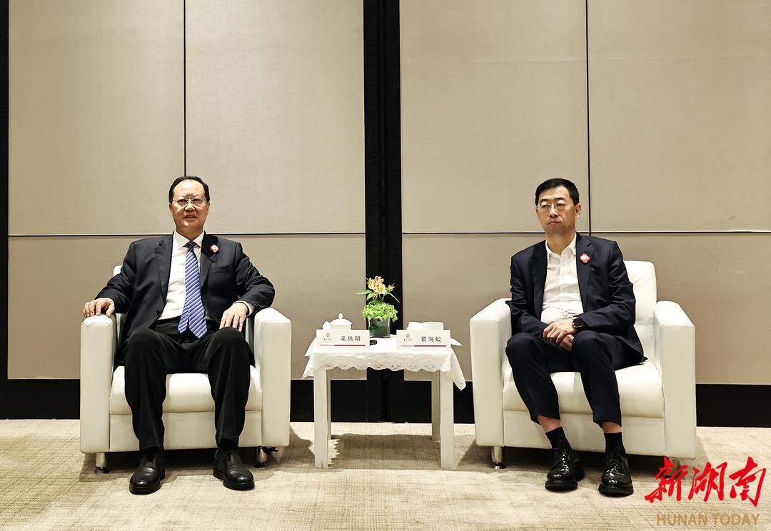 在沪期间,省政府分别与中国银行、交通银行举行工作会谈。会谈中,毛伟明对中国银行、交通银行长期以来对湖南发展的大力支持表示感谢。他说,近年来,湖南坚持把金融服务实体经济作为根本宗旨,持续做好科技金融、绿色金融、普惠金融、养老金融、数字金融五篇大文章,经济和金融实现良性循环。截至9月末,全省银行机构各项存贷款余额8.25万亿元、7.44万亿元,同比分别增长7.1%、8.4%。希望与中国银行、交通银行在建设“4×4”现代化产业体系、推进高水平对外开放、服务高水平科技自立自强、推动重大基础设施建设、防范化解金融风险等领域深化合作,为湖南高质量发展持续注入“金融活水”。葛海蛟、任德奇表示,湖南区位优势明显、产业基础扎实、营商环境优越,为各类金融机构在湘发展提供了良好环境和广阔前景。中国银行、交通银行将充分发挥自身优势,将更多优质金融资源投入到湖南重大战略、重点领域和重大项目建设中来,实现共赢发展。