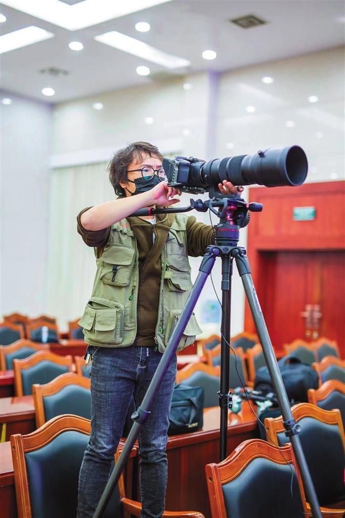 2022年10月28日,《团结报》创刊70周年会议召开前,记者陈昊架起设备,做好录像准备。