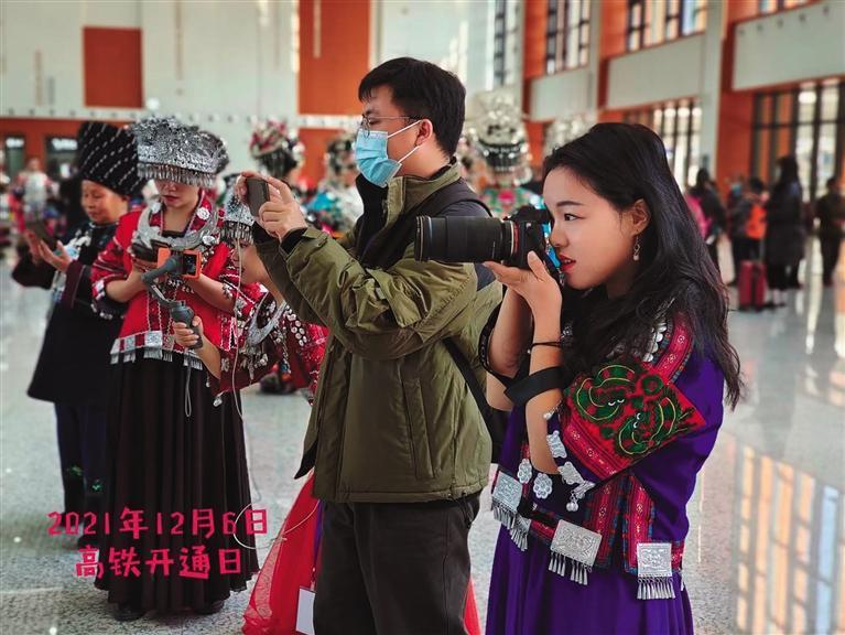 2021年12月6日,张吉怀高铁正式通车,记者李明潇(右一)在凤凰古城站见证高铁开进土家苗寨。