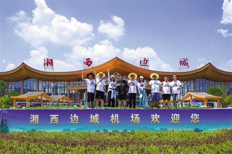 2023年8月18日,湘西边城机场通航,记者杨贤清、欧阳仕君、龙俊玉、龙尧、岳跃强、吴宜芝、朱开朗、林云、胡迎赢(从左至右)在现场采访。