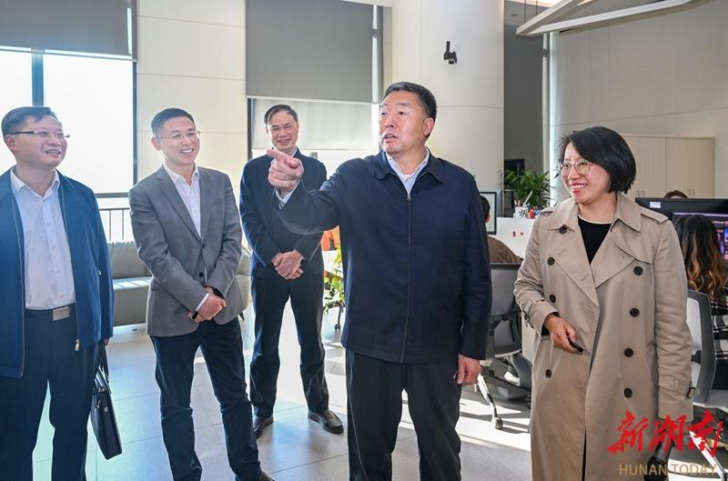 11月7日下午,省政协主席毛万春带队围绕“讲好湖南故事 助力文化强省建设”在湖南日报社调研。图为毛万春在湖南日报社时政频道和“湘伴”工作室调研。