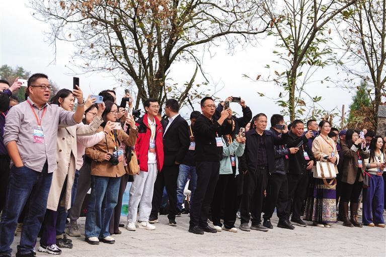 在永顺县双凤村,记者、嘉宾们纷纷拿出手机记录精彩的民俗活动表演。 团结报全媒体记者 杨贤清 摄