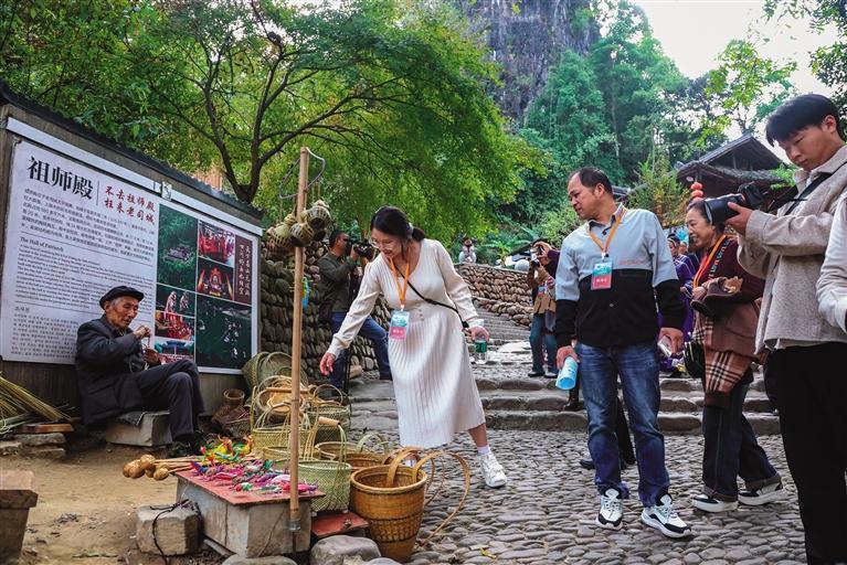 嘉宾在老司城遗址参观,遇上手艺人编织竹编,纷纷停下脚步观看。 团结报见习记者 胡承鼎 摄