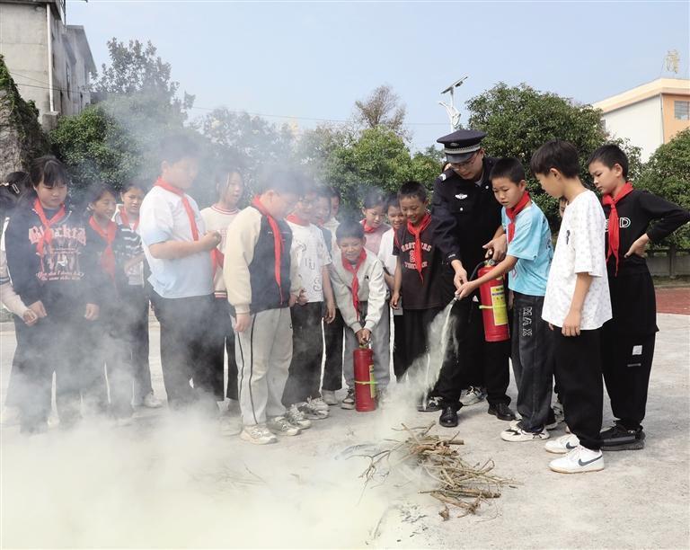 连日来,保靖县公安局组织民辅警走进各中小学校普及消防安全知识,让孩子们从小树立消防安全意识,提高自救避险能力。图为11月6日,清水坪学校的学生在学习灭火器的使用方法。 俞采华 胡胜 摄