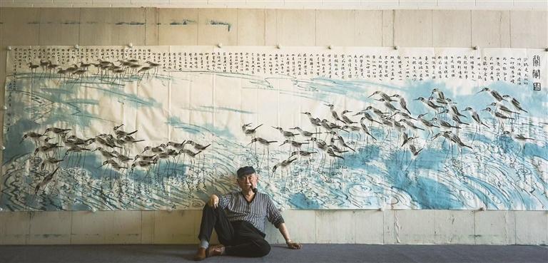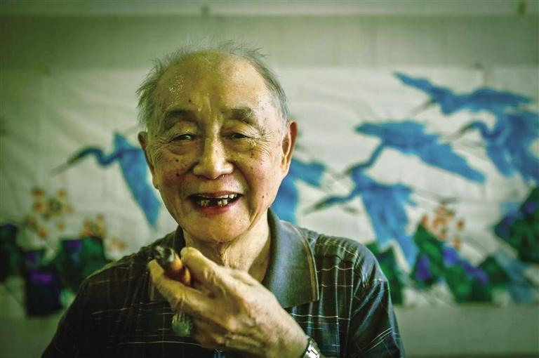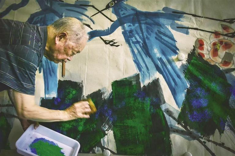 黄老作画时,口中衔着的雪茄,他觉得是吸取了智慧。手里拿起了排笔,又是将智慧艺术化、具象化。这是他在为《仙鹤荷图》着色,人画合一,让人肃然起敬!