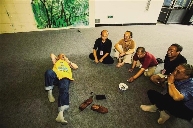 毕竟是八十岁的人了,作画累了,炎热的天气里忙里偷闲歇口气。但毕竟是黄永玉,笑得多轻松!