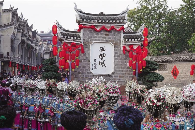 长龙喜宴上,凤凰血粑鸭、苗家腊肉、凤凰稻花鱼、禾库牛肉丝、凤凰社饭、蒿菜粑等特色菜品摆满了长桌。拦门酒、过竹筛、跨火盆,传统婚俗里包含着浓浓的祝福;乘坐磁浮观光快线,在“凤凰样子”围着篝火狂欢,新式仪典代表着新时代也有了新婚俗。