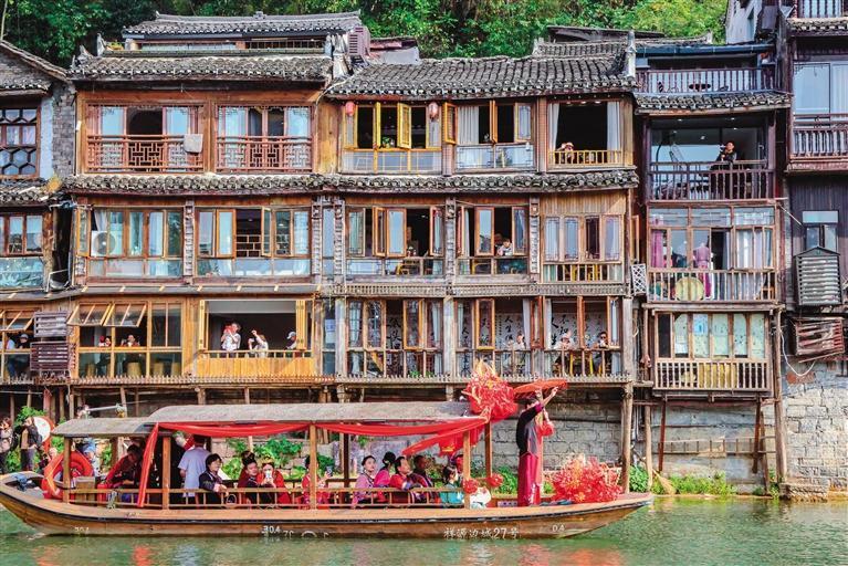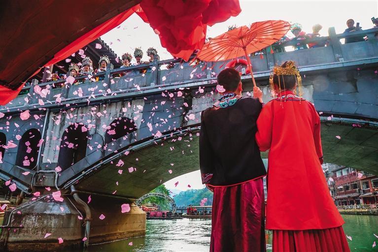 吊脚楼、游船、沱江,展现了一场独属于凤凰古城的浪漫婚礼。 团结报见习记者 胡承鼎 摄