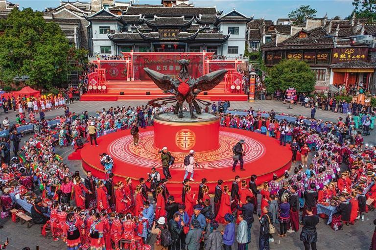 集体婚礼当天,凤凰文化广场上,新人们身着传统与现代、民族与通俗相融合的定制款婚服,宛如凤凰般耀眼,他们手持红绸带,在一首欢快热烈的苗族音乐鼓舞《欢天喜地迎新人》中,徐徐登场。
