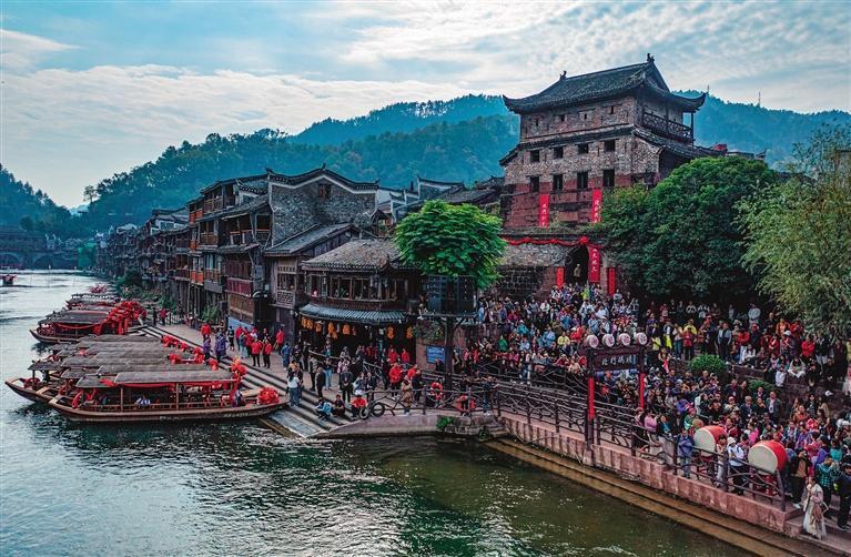 “百年好合”“新婚快乐”“早生贵子”,一路上,游客为新人们送上最诚挚的祝福,并且纷纷拿出相机手机拍照留念,就连外国游客也徜徉在中国婚礼的喜庆氛围里,对着新人们欢呼致意。在这幅喜庆的画卷里,一砖一瓦,一石一木,以及身处凤凰古城的每一个人,都是不可或缺的。