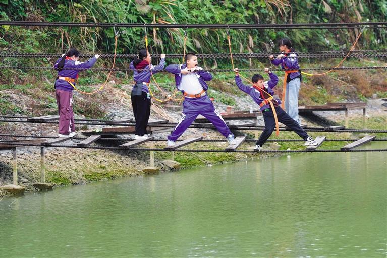 “飞夺泸定桥,是红军长征中的一场重要战斗……”在“飞夺泸定桥”活动区,基地里的教官先为孩子们讲述了红军长征的故事,接着指导大家扣上安全绳,一一登上“铁索桥”,进行沉浸式体验。