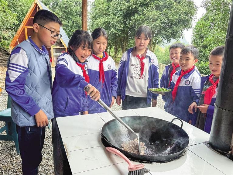 “洗完锅后,要等锅中的水干了才能倒油。”“青椒炒肉,要先炒肉,后下青椒。”“柴火不能烧太旺,要不然会把菜炒煳。”……在开心厨房活动区,孩子们分为若干小组,分工有序,围着灶台大展身手。烟火氤氲中,一道道香气扑鼻的菜肴纷纷出锅。