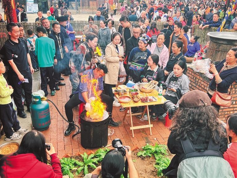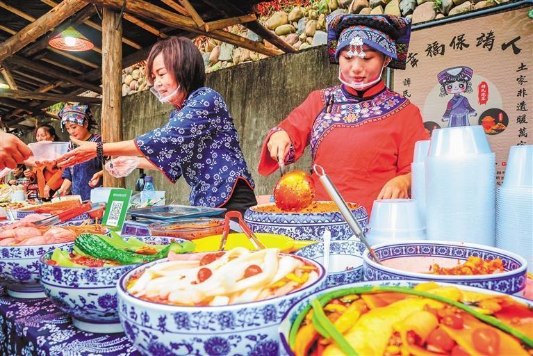 与村厨同样精彩的还有村艺展示。非遗雕刻、剪纸、鼓舞、麻阳长河摇橹号子、范家山云飞燕大鼓、苗家武术、土家服饰走秀……非遗文化穿插在大晒场,游客来到保靖,不仅吃得舒心,更能看得开心、玩得顺心。