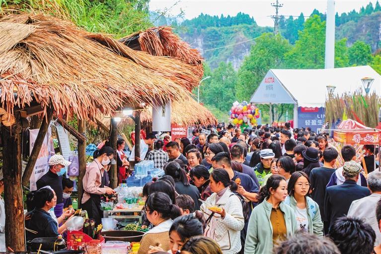 “村集”上人潮如织,游客们嘴里吃着,手上提着,收获满满。 团结报见习记者 胡承鼎 摄