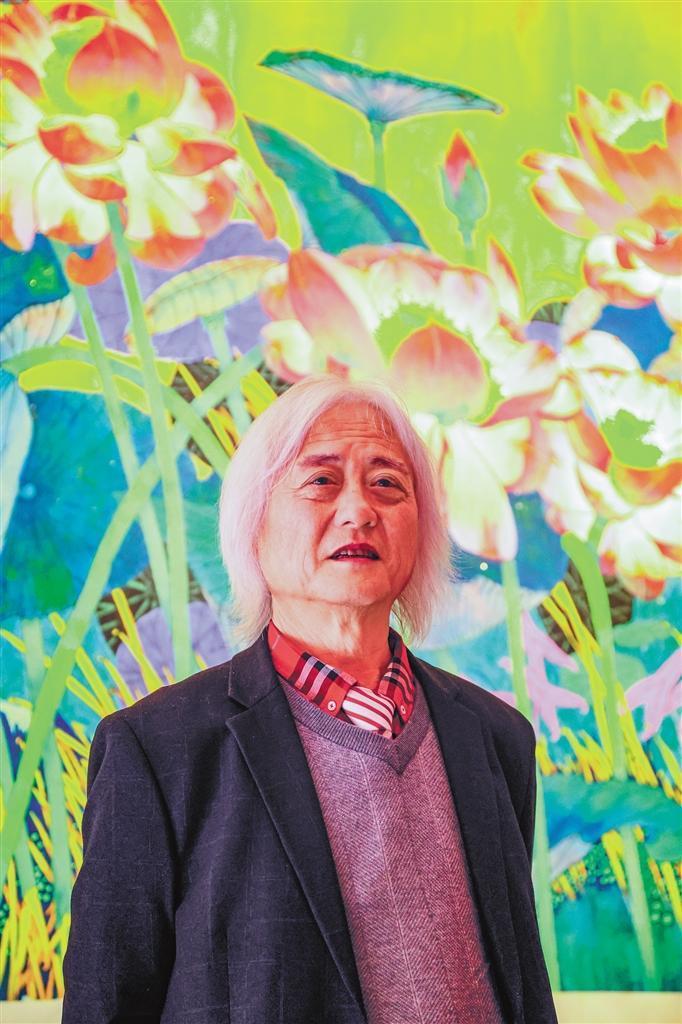 毛光辉站在画作《芙蓉国里尽朝晖》前。
