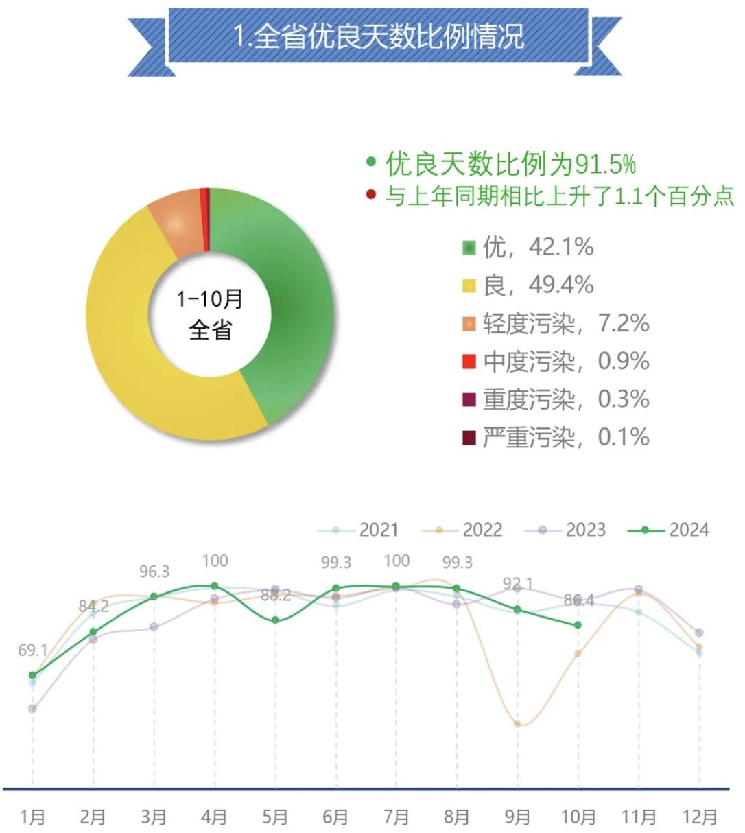 看空气质量,全省14个市州所在城市平均优良天数比例为91.5%,较去年同期提升1.1个百分点。今年以来,我省深入打好“蓝天保卫战”,1月份,全省空气优良天数比例为69.1%;此后持续走高,4月份、7月份达到100%;8月份后受传输性污染物和秸秆焚烧等因素影响,空气优良天数占比从99.3%回落到86.4%,总体仍优于去年同期水平。