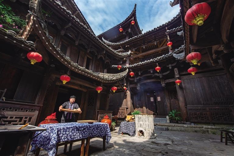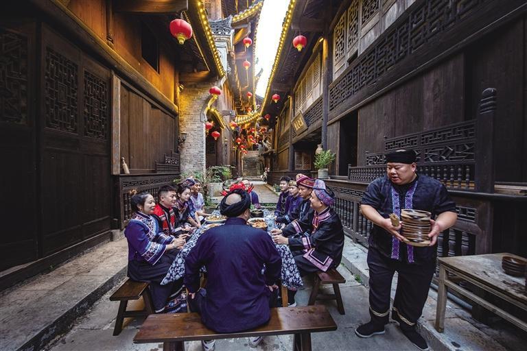 土家牛头宴,又称“开大宴”。据载,土司每年正月必椎牛以祈祥,明嘉靖年间,彭翼南大败倭寇,土家儿女支起100口大锅,熬牛头犒劳三军,大摆牛头宴,恭迎土司王凯旋归来。“牛头宴”承载着土家先民的荣耀和希望,现在逐渐演变成土家族接待贵宾的盛大礼仪宴会。