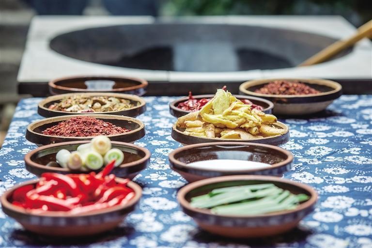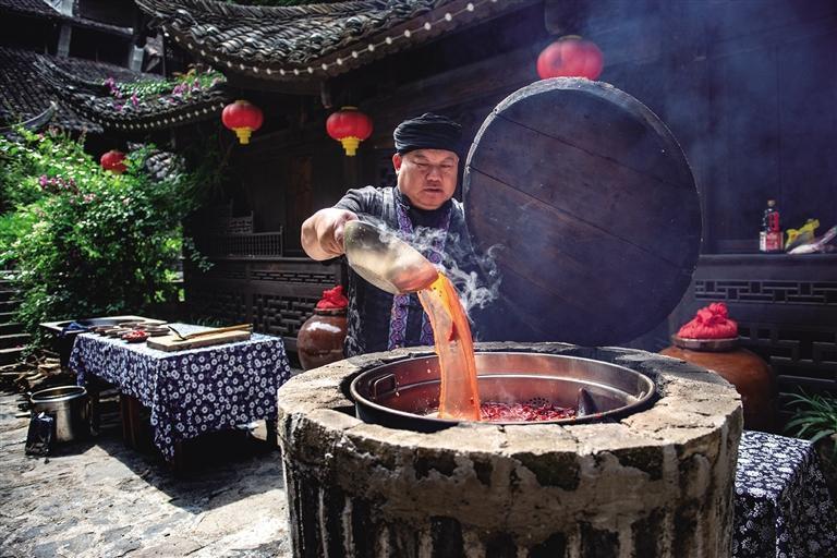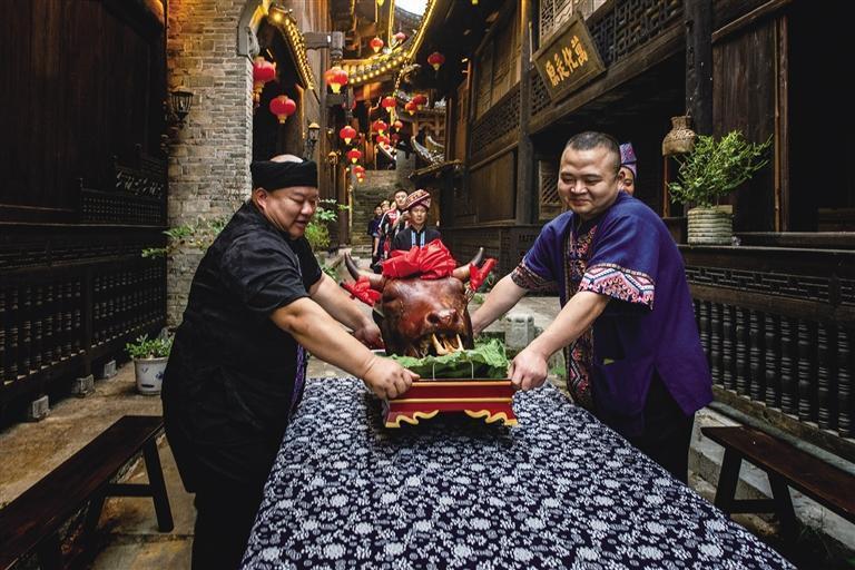 牛头宴,每一口牛头,都是对古老食俗的深情致敬。制作过程也非常讲究,通常选用整只牛头进行洗、烧、腌、煮、焖等10多个小时的复杂工序烹饪,配以多种调料和辅料,确保肉质口感鲜嫩,令人回味无穷。从皮脆肉嫩,到骨髓香浓的醇厚,每一部分都蕴含着丰富的风味,从而展示出高超的厨艺和土家饮食文化的传承。