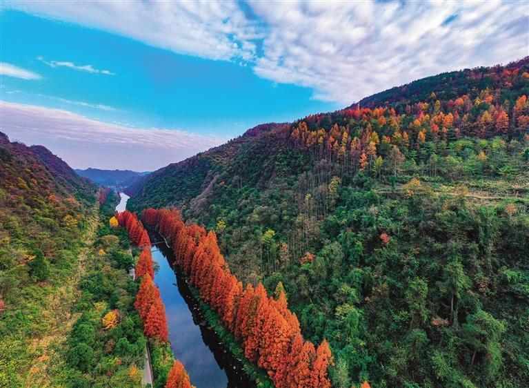 蓝天、白云、水杉树,齐齐映在沱江之中,像极了一幅油画。 团结报见习记者 胡承鼎 摄
