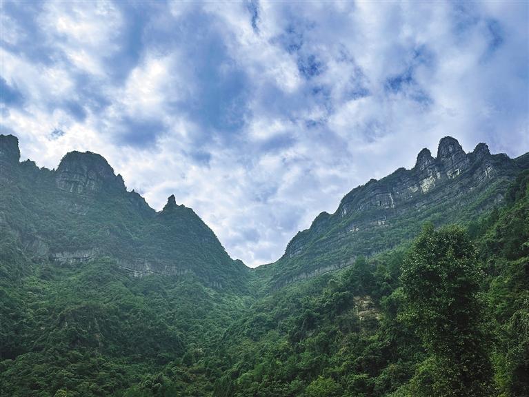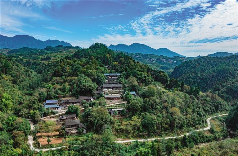 从西眉村仰望八面山,两座山坳间,正是上八面山的古道,古道直通川渝。 团结报全媒体记者 石健 摄