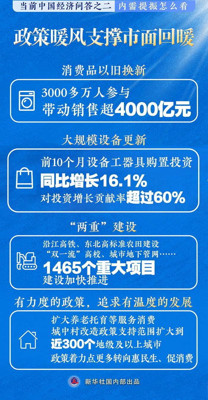 针对经济运行中的新情况新问题,党中央果断决策,一揽子政策协调配合、同向发力,扩内需导向十分鲜明。