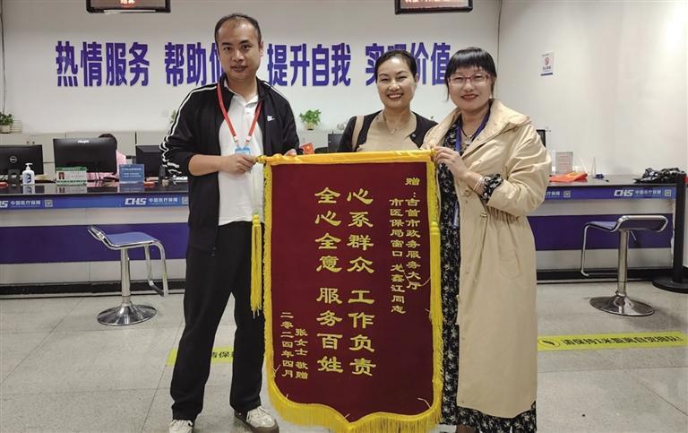 2024年4月,吉首市参保对象张女士将一面印有“心系群众 工作负责 全心全意 服务百姓”的锦旗送至吉首市医保服务大厅工作人员手上。