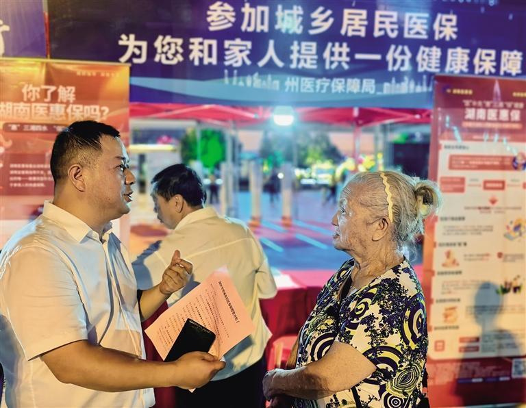 2024年9月29日,湘西州医疗保障局与州民族中医院、国家税务总局湘西州税务局、“医惠保”承办公司携手开展“人人参保有‘医’靠 家家健康享平安”暨“中医药文化夜市·迎国庆送健康”大型义诊活动。活动中,工作人员向居民大力宣传医保政策。