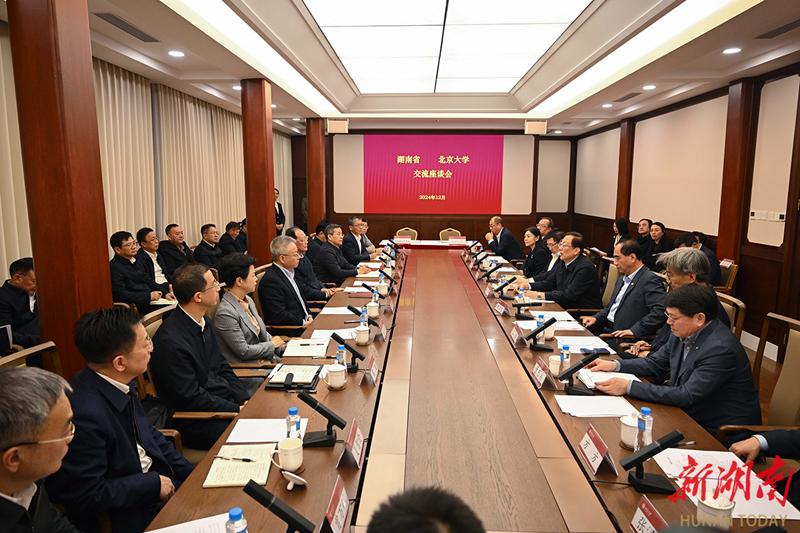 龚旗煌介绍了北京大学近年来贯彻落实习近平总书记重要讲话精神,在人才培养、师资队伍、学科建设、科学研究、开放办学等方面取得的一系列新成绩新突破。他表示,北京大学始终高度重视与湖南的合作,双方在人才交流、科学研究等领域取得了丰硕成果,希望以签署新一轮战略合作协议为契机,双方进一步巩固合作成果,共同推进更深层次、更高水平的务实合作,为以中国式现代化全面推进强国建设、民族复兴伟业,携手作出新的更大贡献。