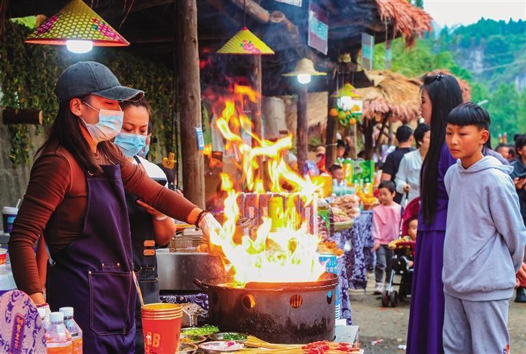 烈火牛肉色香味俱全,熊熊燃烧的烈火,点燃了游客的心。 团结报见习记者 胡承鼎 摄