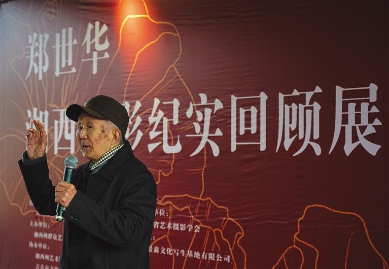 面前,戴着鸭舌帽、笑眯眯的精神老头儿,正是本次摄影展的主角——87岁的郑世华先生,他正在给身边拄着拐杖的友人讲这些照片背后的故事,不时哈哈大笑,像极了一个向朋友炫耀新玩具的可爱小男孩儿,而从12月18日至26日在这里展出的146张老照片,就是他拿着自己的“大玩具”照相机,走遍湘西的山山水水记录下的真实“湘西”。