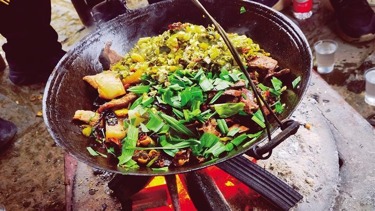 这个季节,杀年猪不失为庄稼人生活中的精彩章节。进入腊月,大地笼罩在“小寒”节气之下,乡村却是一番热火朝天的景象。“天气冷了,猪只吃不长,早点杀算了。杀了,好熏腊肉,好做香肠,过年好呔(吃的意思)。”大伙这般言语的时候,年猪宰杀潮如春汛般涌来。此起彼伏的猪嚎声穿越乡村的寂静和节气的寒冷,飘向远方。杀年猪,谁家都不会落下一顿吃得有余有剩的刨汤肉盛宴。此时,不论帮忙人员,还是看杀猪“把戏”的,众人围坐一桌桌火锅,大碗喝酒,大块吃肉。那“一心敬老、二梅有喜、三生财多、四季发财、五福临门、六位高升、七财七喜、八方大利”的划拳猜令声,荡漾在乡村上空。
