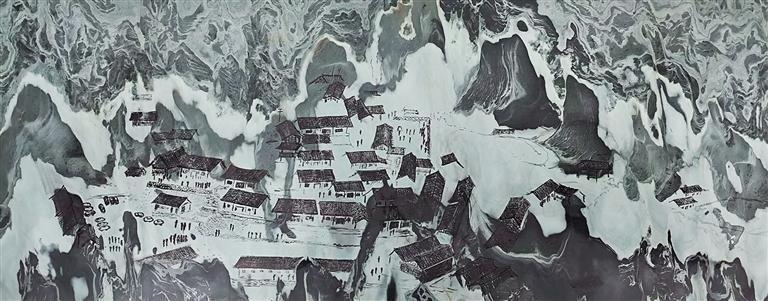 龙正贤在他正在创作的作品《绿水青山十八洞》中,把石材的天然纹理和焦墨画融合到一起。