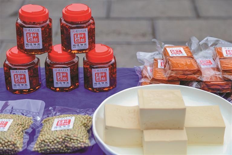 豆腐宴上,各式各样的豆腐菜吸引了游客的注意。有冻豆腐、炸豆腐、炕豆腐、水豆腐、卤豆腐,各种豆腐味道各异,又都鲜美清香,正如吉首市坪朗豆腐有限责任公司负责人——石清香的名字一样。