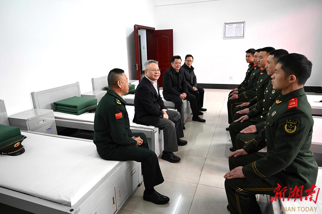 沈晓明来到驻省委大院武警中队,实地察看官兵宿舍、学习室、值班室、食堂,与官兵们面对面交流,了解大家的工作、学习、生活以及年夜饭准备等情况,代表省委、省政府对过去一年武警部队为湖南经济社会发展所作的重要贡献表示感谢,并要求参加慰问的省直有关单位认真落实拥军优属政策措施,切实关心执勤战士的工作、学习和生活,帮助解决实际困难。