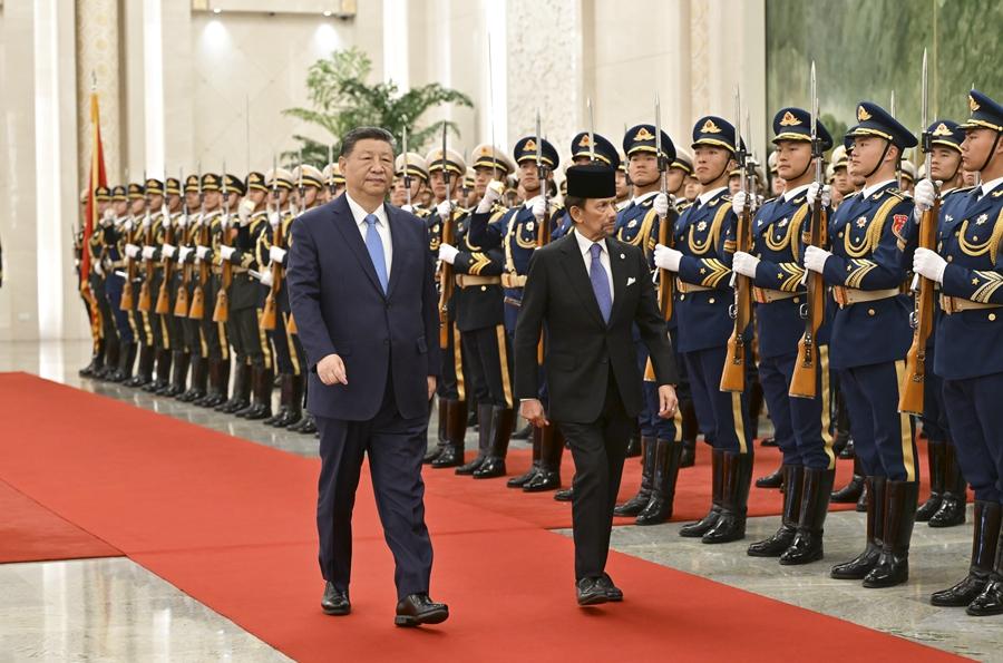 2月6日上午,国家主席习近平在北京人民大会堂同来华进行国事访问的文莱苏丹哈桑纳尔举行会谈。这是会谈前,习近平在人民大会堂北大厅为哈桑纳尔举行欢迎仪式。新华社记者 李响 摄