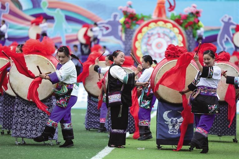 目前,保靖县已有湘西苗族鼓舞国家级非遗传承人1人,州级传承人2人,县级传承人10余人。苗鼓,最初仅用于驱赶野兽,后来用于军事上指挥、布阵、传递信息等,如今,逐渐演变成苗家儿女交流情感的一种文艺表演形式,通过“+武术”“+音乐”“+苗族文化”等创新发展,演绎出几十种苗鼓的不同打法。