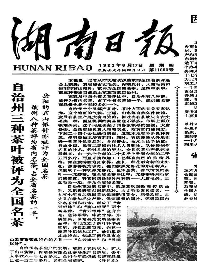 1982年《湖南日报》头版头条报道“保靖岚针”为全国名茶。