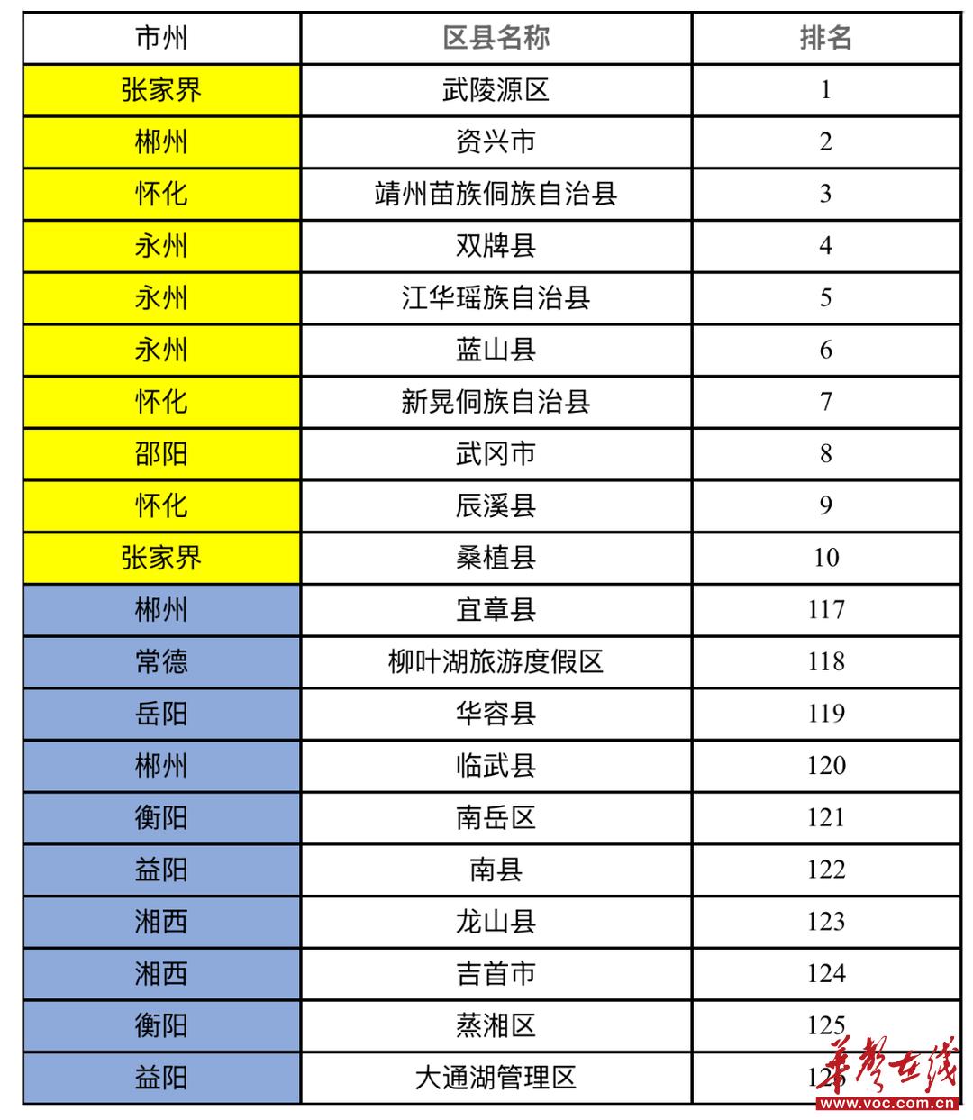 1月,按照城市水质综合指数评价,全省126个县(市、区)地表水环境质量状况排名,前十名依次为:武陵源区、资兴市、靖州苗族侗族自治县、双牌县、江华瑶族自治县、蓝山县、新晃侗族自治县、武冈市、辰溪县、桑植县。后十名依次为:宜章县、柳叶湖旅游度假区、华容县、临武县、南岳区、南县、龙山县、吉首市、蒸湘区、大通湖管理区。