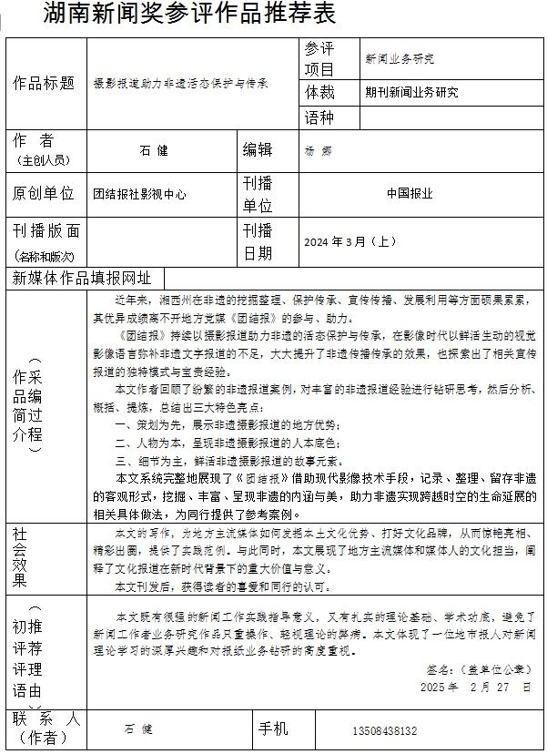 多年来,《团结报》非遗摄影报道在全国性摄影大赛以及中国地市报、湖南省市州报、湖南新闻奖等各大新闻及艺术摄影竞赛中屡屡斩获头奖、摘得桂冠,硕果累累,成绩喜人。近年来,非遗摄影报道在完成内容生产后,通过“红湘西”客户端、“湘西头条”微信公众号等开辟专题栏目,在原有基础上加入视频、音乐和文字内容,进行融媒传播、立体宣传,满足了新时代受众多元化的信息接受方式,使其覆盖面更广泛、传播更有效。