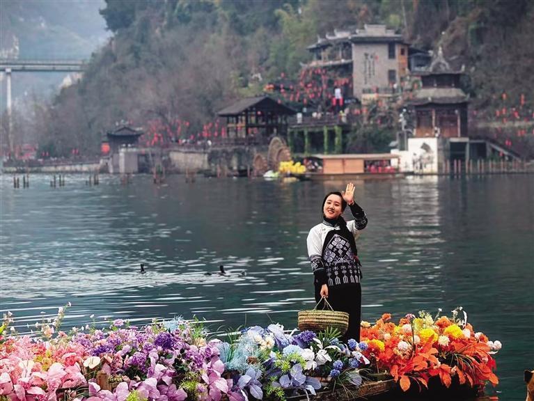 3月5日,小雨夹着雪粒,花垣县边城茶峒景区清水江两岸,油菜花冒雨盛开。河街上酒旗湿漉漉垂着,饭馆掌柜探出头,招呼从乌篷船上下来的姑娘:“‘翠翠’哪里去?先来躲会儿。”