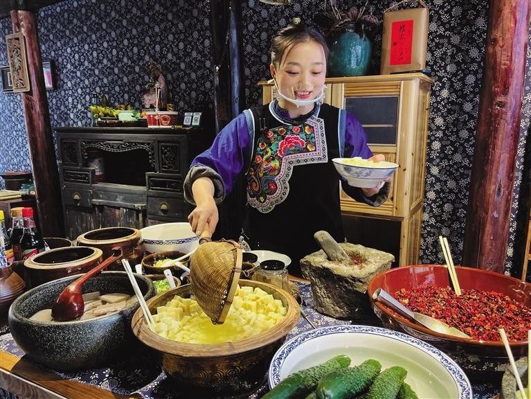 “一碗米豆腐,所有调料都来一点。”3月7日,距离午饭时间尚有一段距离,“翠翠”在乾州古城经营的小吃店便已忙碌起来。“一进店就点米豆腐的,大多是常客。开店之初,我心里也犯嘀咕,担心‘众口难调’,没想到现在它竟成了店里的‘必点招牌’,我也蛮开心的。”“翠翠”笑说。