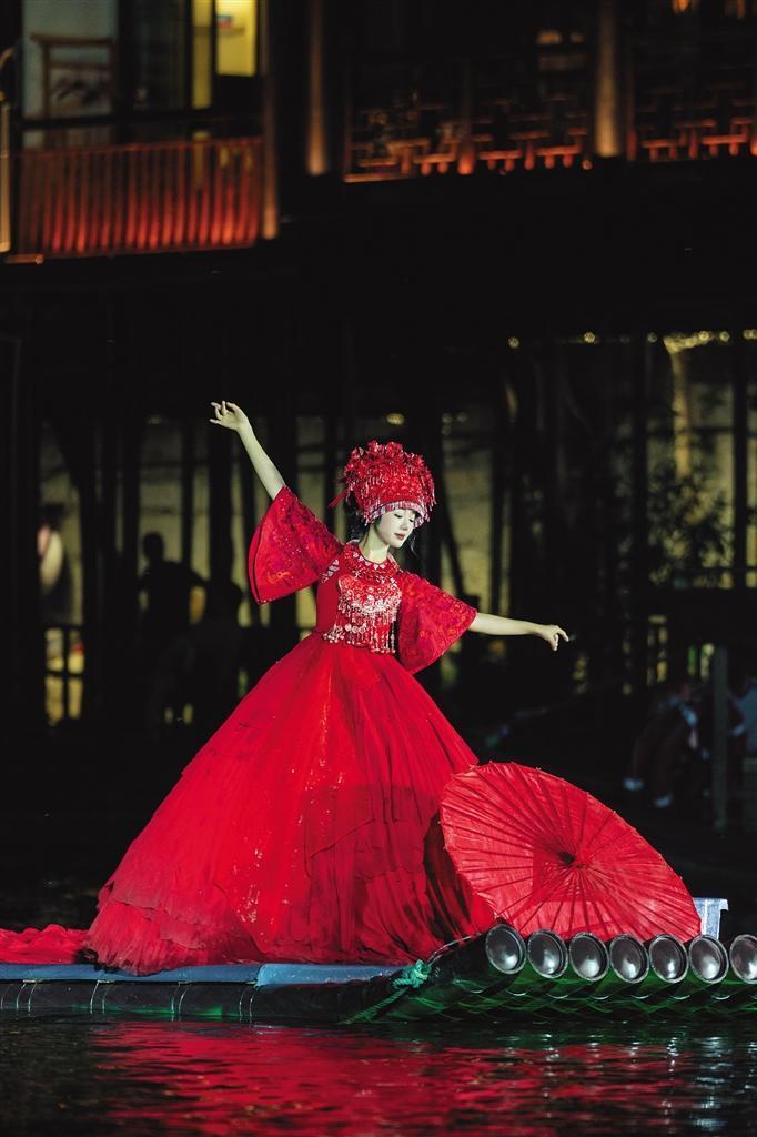 凤凰古城《湘见·沱江》演艺的游船上,红衣“翠翠”以舞姿推开凤凰的月影,将沈从文的文字化作可触摸的梦境。