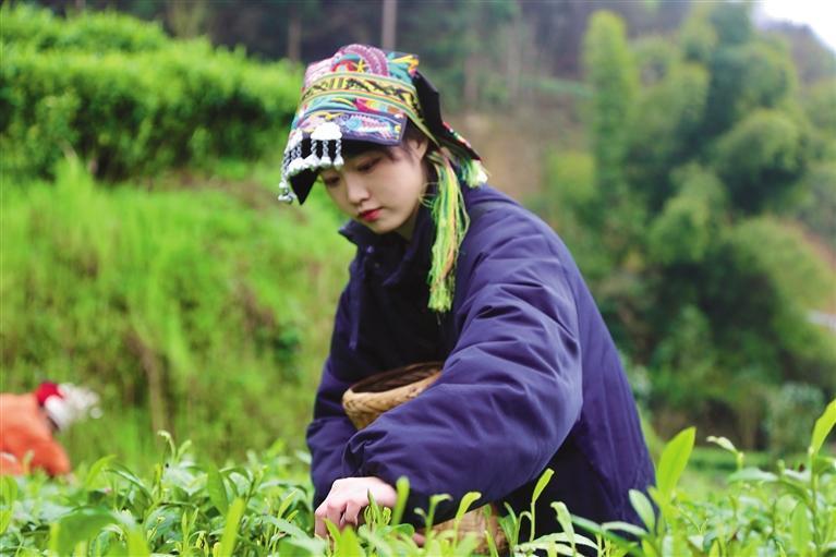 又是一年采茶时,苗家姑娘采摘茶叶,人入景作画。