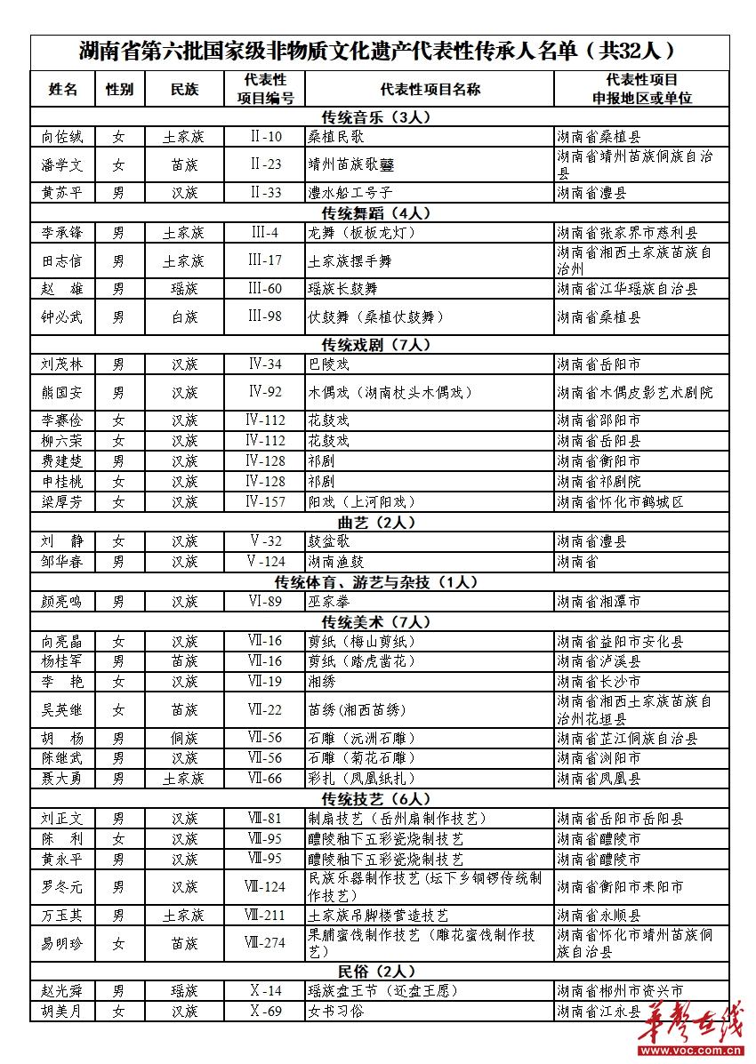 华声在线3月17日讯(全媒体记者 李梓潇)近日,文化和旅游部公布了第六批国家级非物质文化遗产代表性传承人名单,共942人。其中,湖南32人入选。